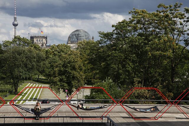 The Sleeping Cells are metal frames with hammocks in which people can take a rest. They can be placed outside or inside the theatre, or even in the city, in public places like parks, on squares, by the river, etc. They encourage passers-by to take a nap.