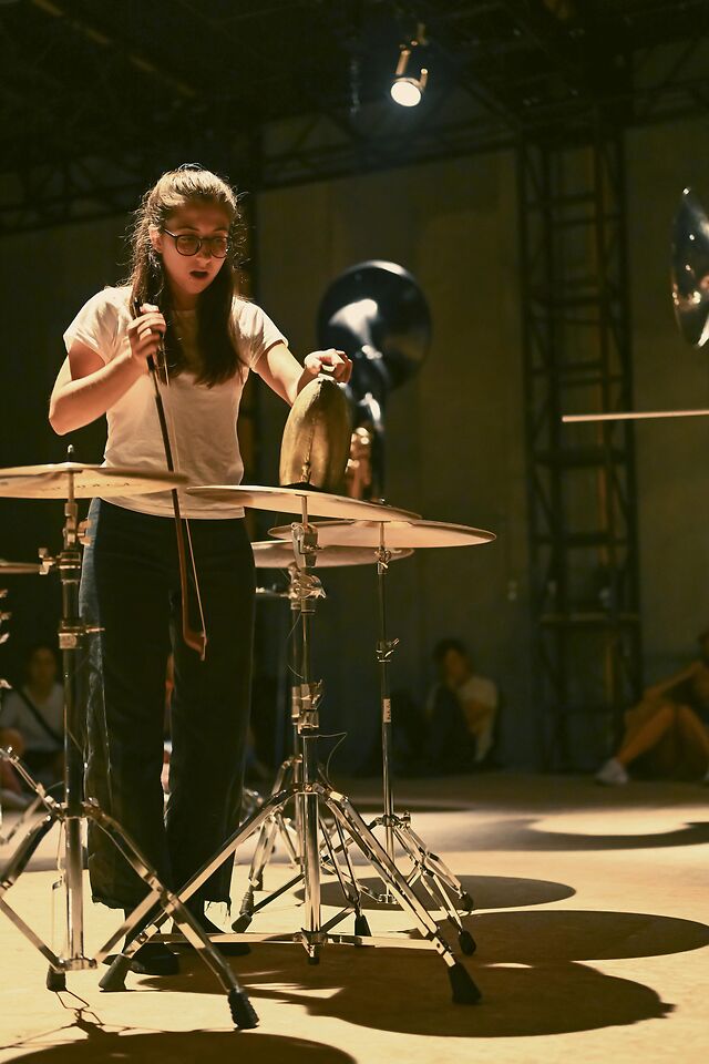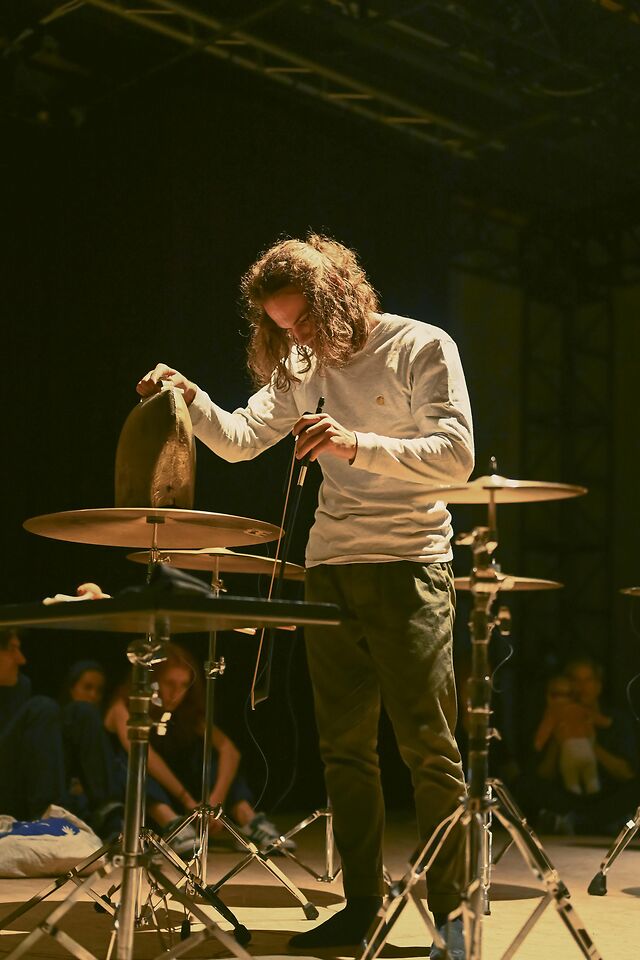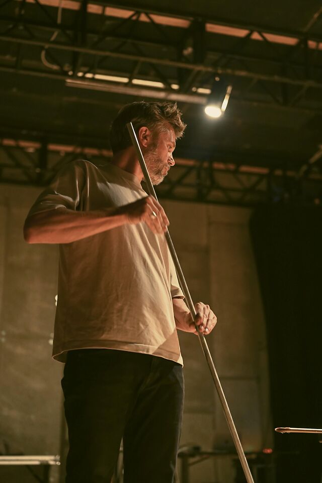 The exhibition will conclude with a series of musical performances. Lucas Messler and Anita Cappuccinelli of the Brussels-based collective TUUM explore the melodic, rhythmic and electro-acoustic possibilities of percussion instruments such as cymbals. The gestures of the musicians are also a source of sound, resonance and feedback. Multimedia artist Gert Aertsen created an installation with aluminum rods. Through specific stroking and bowing, these become a new kind of instrument. The sine waves produced by the activation of this installation continue the lines of rods through the space, as it were. This attention to detail and to the materiality of instruments and sound resonates with the finesse of the other works in EXTRACTIONS 23. As such, attention contrasts with extraction, creation with destruction. Kristof van Baarle