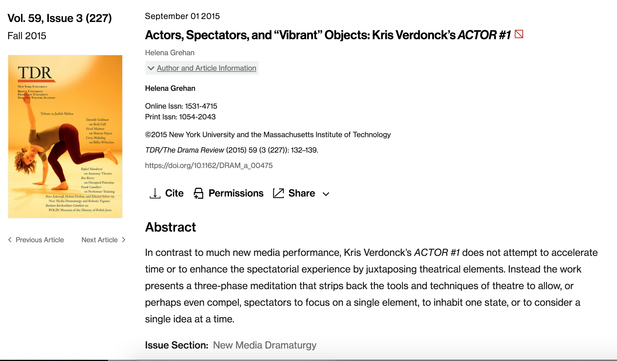 GREHAN, Helena. TDR/The Drama Review, Vol. 59, Issue 3 (227), p. 132–139 (2015)