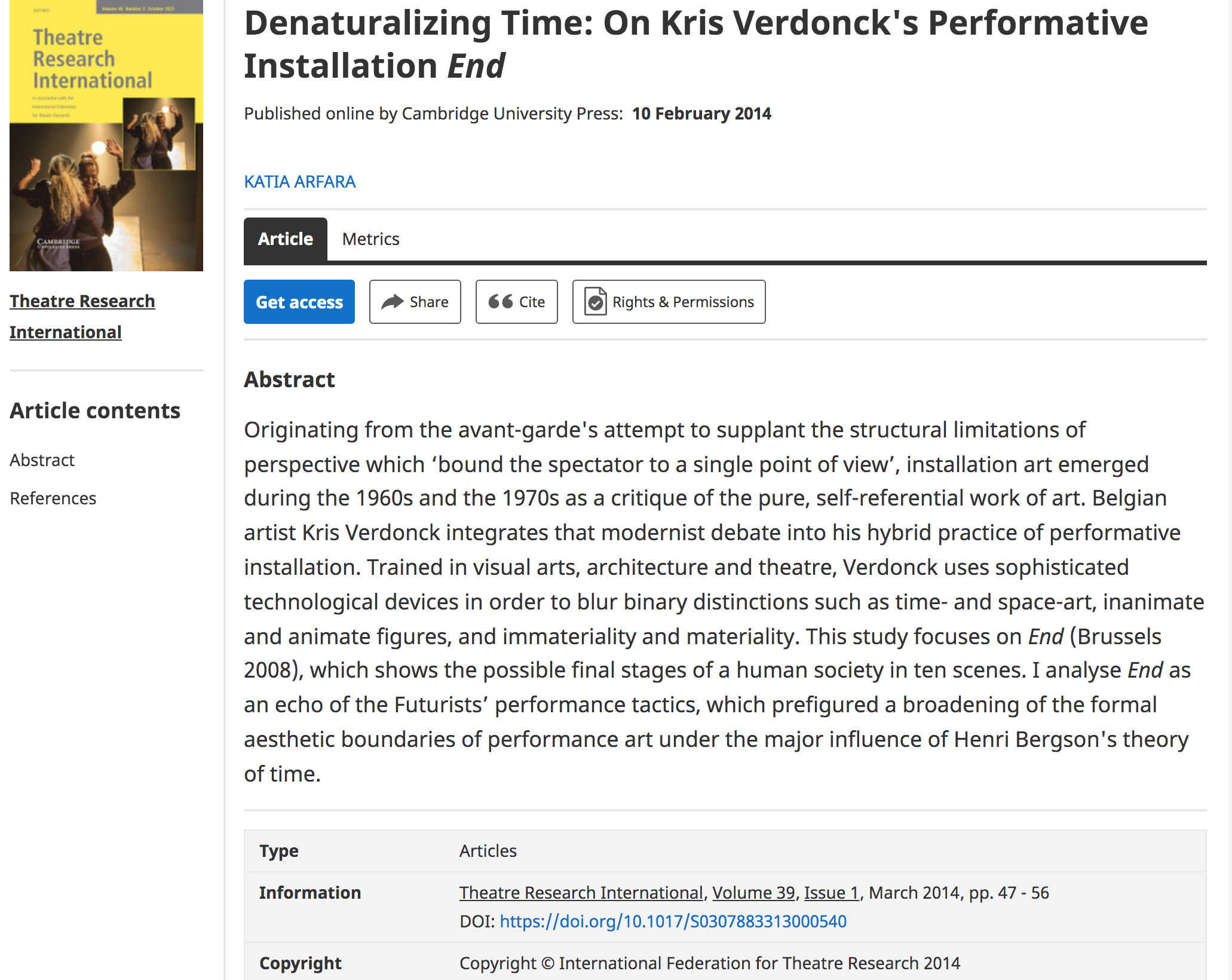 ARFARA, Katia. Theatre Research International, vol. 13 (1), p. 47-56 (2014)