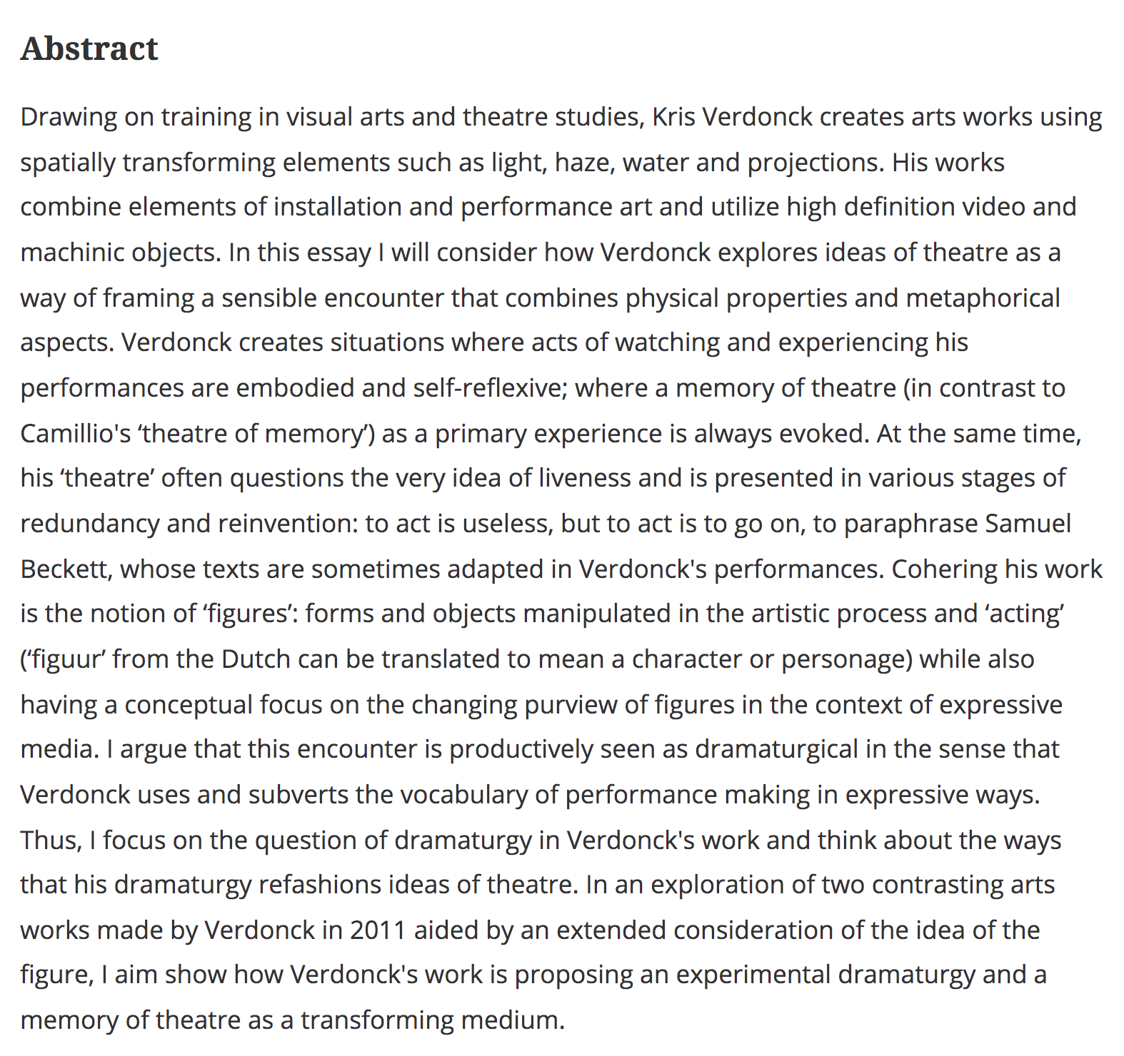 VERDONCK, Kris. Lecture during Bodies on Stage: Acting Confronted by Technology. Paris, La Sorbonne (2015)