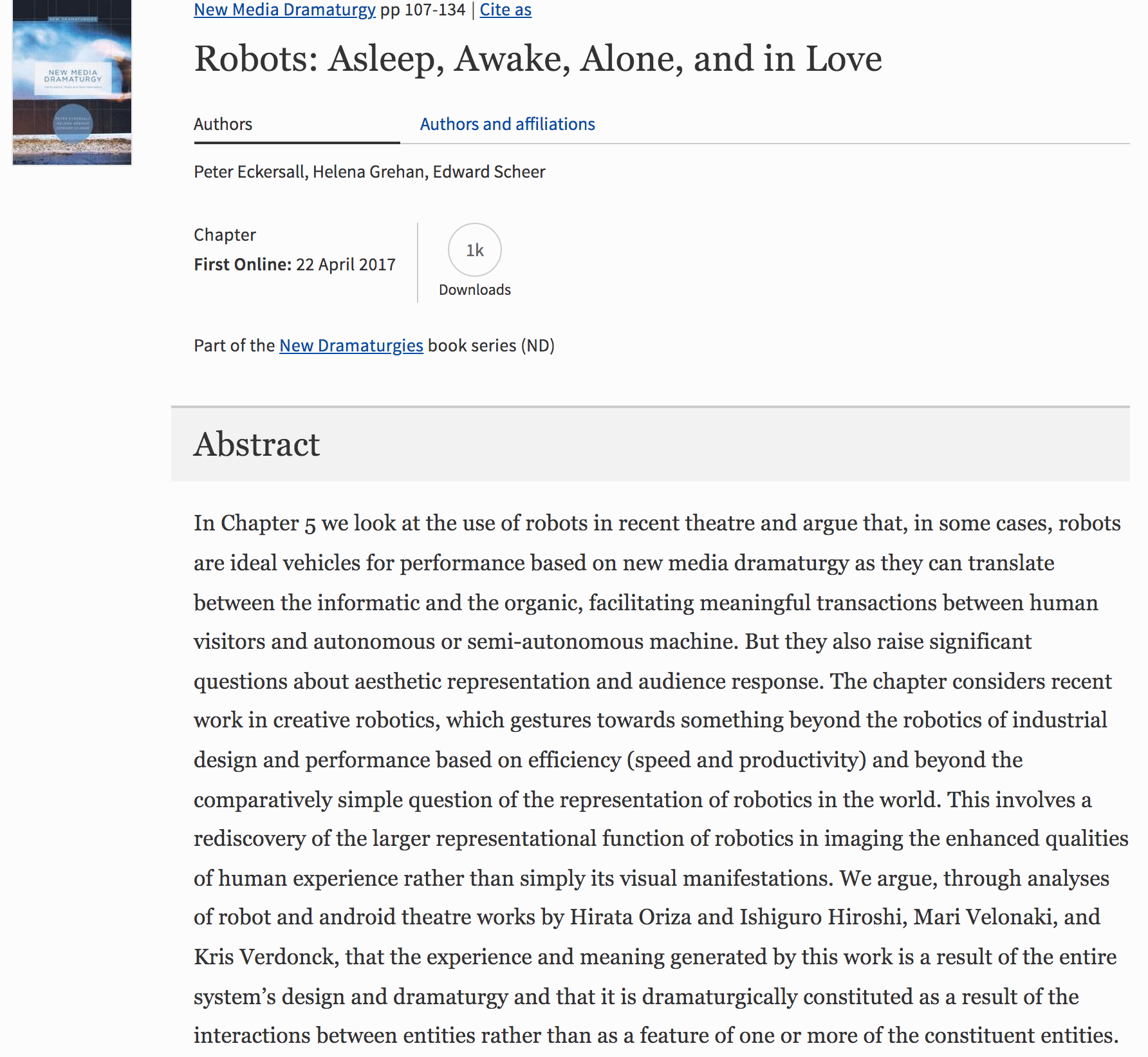 ECKERSALL, Peter; GREHAN Helena; SCHEER, Edward. New Media Dramaturgy. New Dramaturgies. Palgrave Macmillan, London (2017)