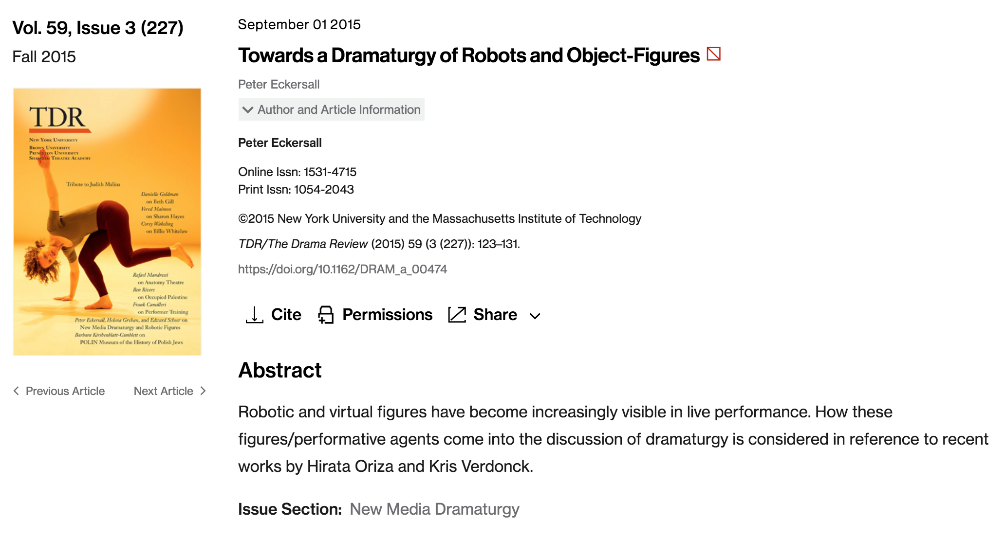 ECKERSALL, Peter. TDR/The Drama Review, Vol. 59, Issue 3 (227), p. 123–131 (2015)